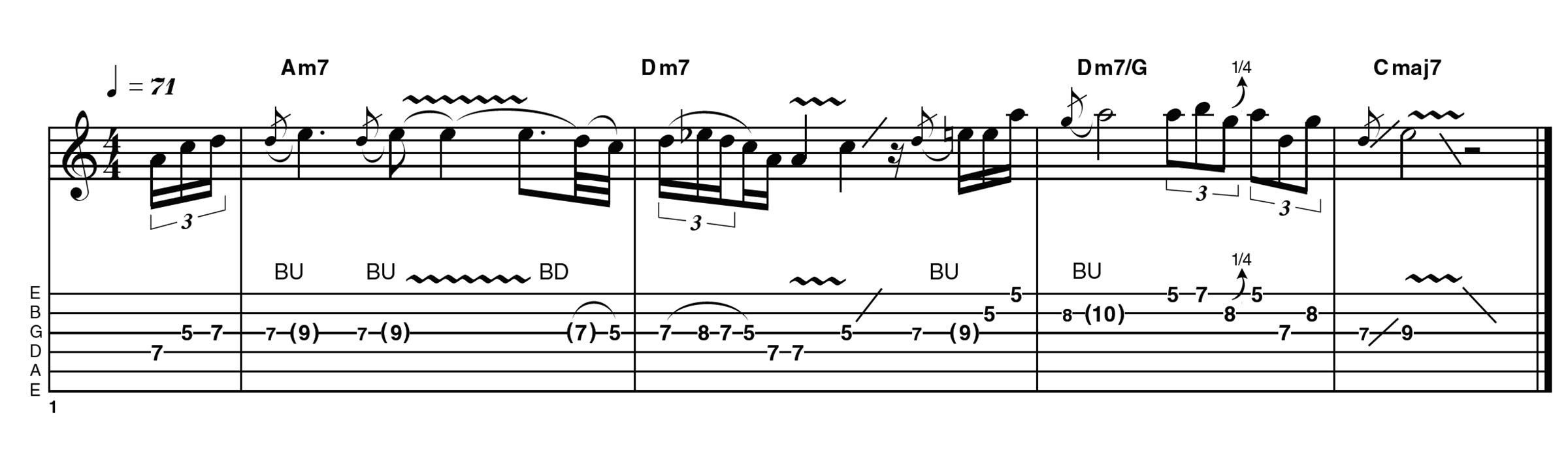 This opening phrase stays largely within the shape 1 A minor pentatonic, featuring held bends and controlled vibrato. We’re starting low and keeping things relatively simple and melodic for now, leaving some headroom for later on.
